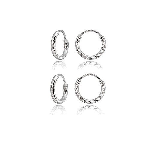 2 Pair Set Sterling Silver Diamond-Cut Tiny Small 10mm Round Lightweight Unisex Endless Hoop Earrings