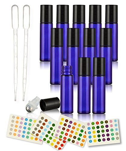 HIGH QUALITY ROLL ON BOTTLES: Set includes 12 empty cobalt blue glass roller bottles with metal roller balls and black screw on caps. Complete set comes with 2 liquid droppers, 70 color coded sticker labels with printed essential oil names, and 80 blank multi-color labels.