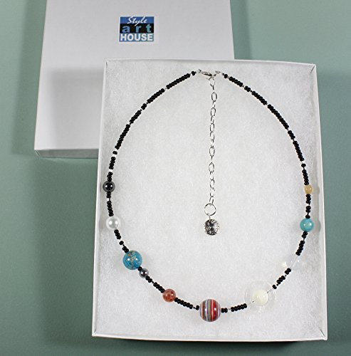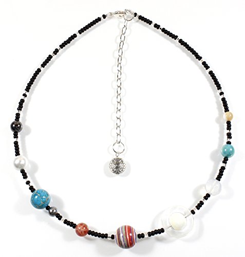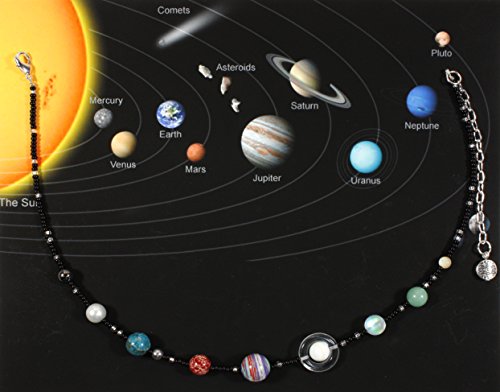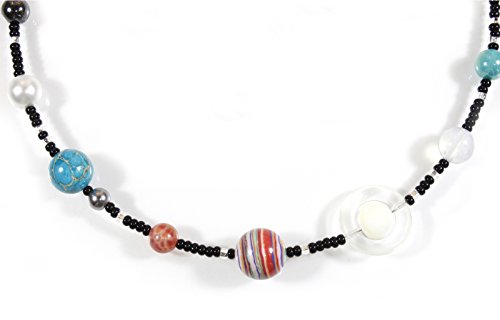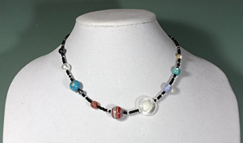 This is the coolest necklace for someone who likes astronomy! Here we have the nine planets laid out in beads: Mercury, Venus, Earth and Moon, Mars, Jupiter, Saturn, Neptune, Uranus, and yes, Pluto; tiny black beads represent outer space with tiny shiny silvertone beads representing the stars!