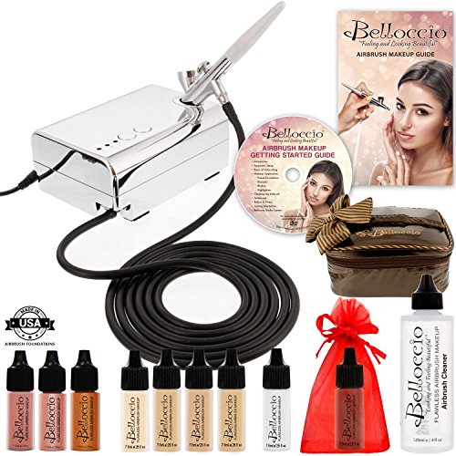 -. Feature : Belloccio® Cosmetic Makeup Airbrush & Compressor System with 1 Year Free Replacement Warranty / Belloccio® FAIR Shade Airbrush Makeup Foundation Set with 4 colors to assure a Perfect Match. / Anti-Aging Moisturizing P.R.Imer (1/4 oz) With Radiant Bronzer, Blush & Highlighter bottles. / Free: Belloccio's® Limited Edition Cosmetic Carry Bag & bottle of Blush / User Guide Manual - Detailed steps for getting the best results when using the Belloccio System.