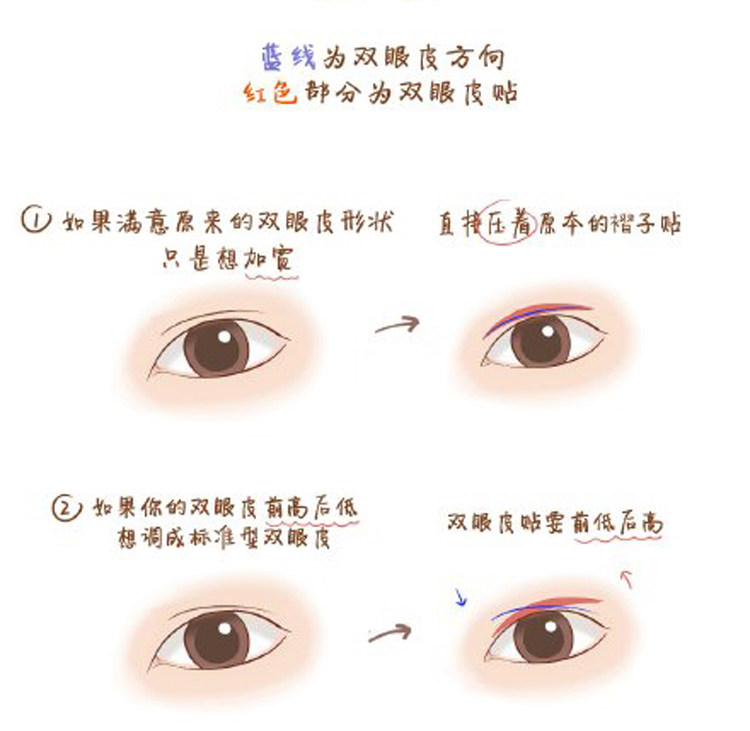 3 使用双眼皮贴。要寻找最适合自己的双眼皮贴,最后是自己DIY动手进行裁剪适合自己眼型的双眼皮贴,月牙形、反转月牙形、新月牙形等,这样隐形效果更好。过宽会容易露馅,过细又会撑不起来,因此要反复练习找到最适合自己的。