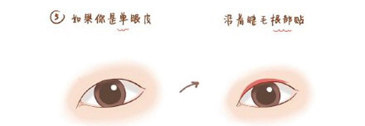 2 用推动棒在眼检上划出双眼皮纹路,轻按九下即可。从睫毛根部4~6毫米以上的眼睑部位化出双眼皮纹路最自然。