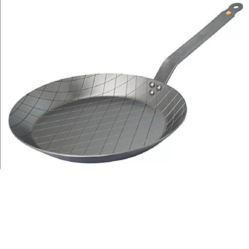 Round rustic carbon steel steak fry pan enhanced non-stick qualities when used for the first time gradual seasoning riveted handle curved in French-style made in France.