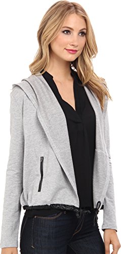 Chic jacket features faux leather drawstring and trim at hem and pockets. Open front with hooded collar. Long sleeves. Side hand pockets with zip closure. Straight hemline. 51% tencel, 45% cotton, 4% spandex; Contrast: 100% polyurethane. Dry clean only. Made in the U.S.A. and Imported.