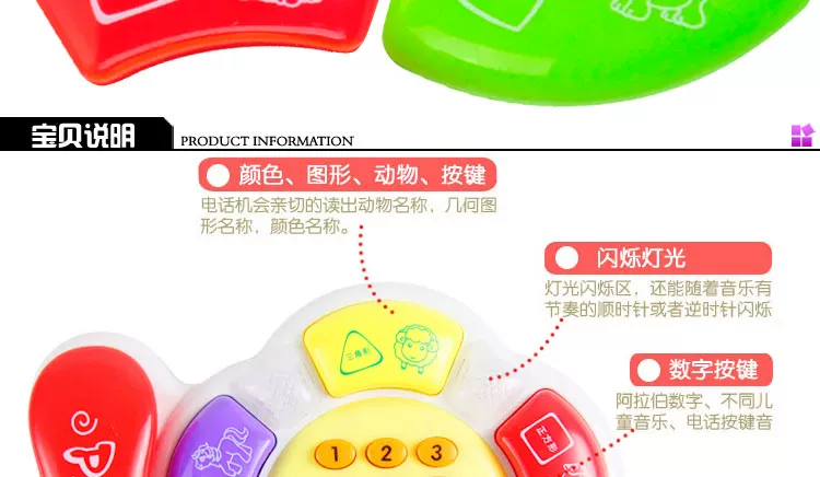 This is a story of early education will be intelligent telephone, bright color,lovely shape, color, animals, shape, numeric button, a switch, baby love on the telephone from the very early, real phone is usually fixed, it is difficult to meet the child's desire, but a function simple, telephone baby other bad alsowon't like, so it can meet the needs of baby telephone calls, but also has more functions can meet the baby needs, is a multi functional telephone, the baby will love it.