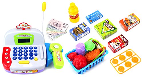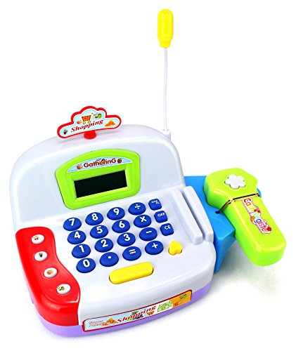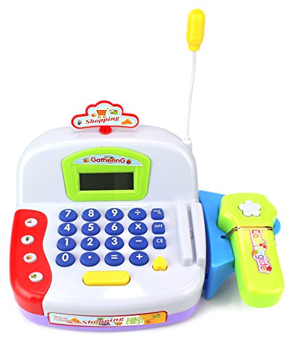 -. Title : Super Amusement Educational Pretend Play Battery Operated Toy Cash Register w/ Working Scanner, Microphone, Money and Credit Card, Groceries