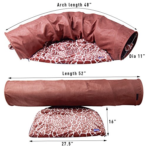 DURABLE AND COMFORTABLE MATERIAL:The removable cushion mat is made of sturdy velvety and the tunnel is made of stronger suede cloth. It will adapt to your pets body temperature perfectly and your cats love napping on it. Tunnel 11" Diameter x 52" L; cushion 28" L x 15" W.