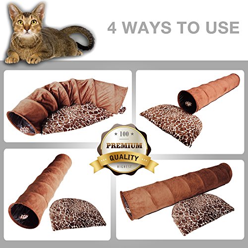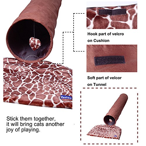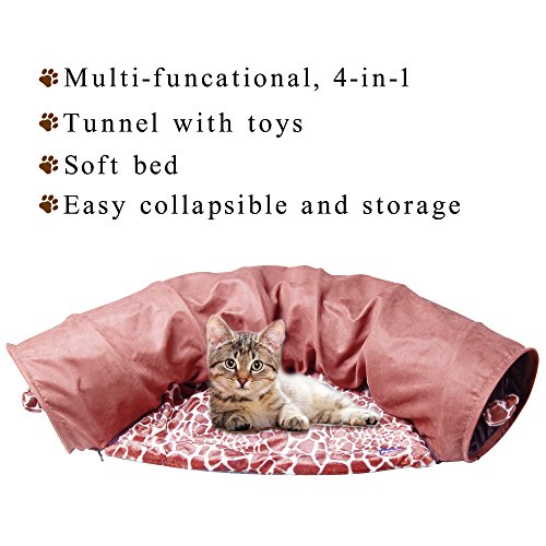 YOUR KITTY WILL LOVE IT:We designed this cat tunnel to provide privacy that your cat will love. The bed and tunnel is made out of soft crinkle lining which will keep your cat entertained. Two attractive dangling plush heart shape balls and a giraffe pattern bed adds more amusements & rich game plays.