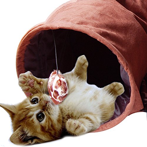 PetLike Cat Tunnel Play Toy and Bed 2 in 1, Collapsible Cat Tube with Removable Warm Plush Bed and Toy for Puppy & Kitten, Kitty Soft Shack House, Size 11"x52", brown