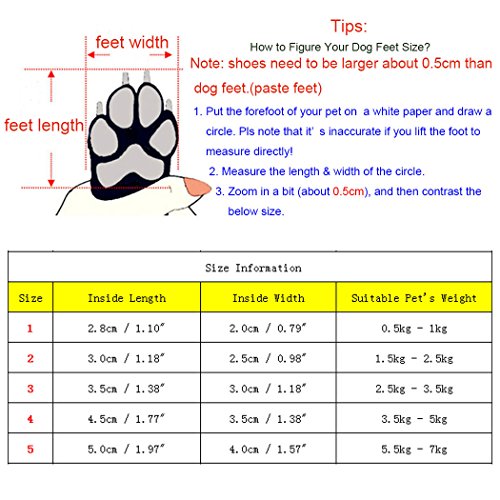 -. Feature : Pet snow shoes are made from high quality plush and pvc rubber material, soft, warm and durable. / Easy to wear with wide split seam top opening, and it's difficult to slip off as it's stickers & antiskid design. / Cute pet paw protectors, keep your pet warm in winter, fashionable and durable, soft and hand washable. / Perfect for everyday wear, holiday, parties, pet dog show & competition, keep your dog stylish and cute. / Please measure the size of your dog's feet according to our tips, then refer to our size chart in the last picture before you place the order.