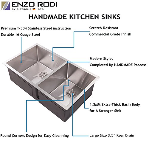 Enzo Rodi ERK124804E-10 33-inch 16 Gauge Undermount Double Bowl 60/40 Stainless Steel Kitchen Sink
