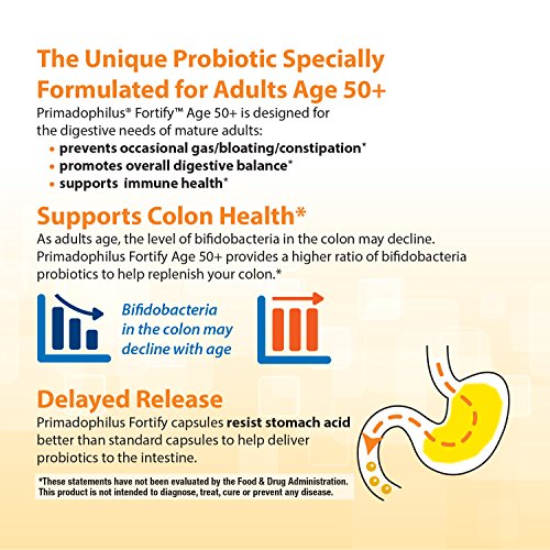 A PROBIOTIC FORMULATED FOR ADULTS 50+: As adults age, the level of Bifidobacteria in the colon may decline. Primadophilus® FortifyTM Age 50+ provides a higher ratio of Bifidobacteria probiotics to help replenish your colon and support digestive balance.*