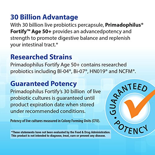 THE ADVANTAGE OF 30 BILLION LIVE PROBIOTICS: With 30 billion live probiotics per capsule, Primadophilus® FortifyTM Age 50+ provides an advanced potency and strength to promote digestive balance and replenish your intestinal tract.*