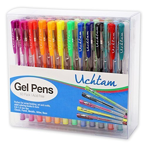 Uchtam Gel Pens set - 60 unique color pack with Case Best suited for kids / Adult coloring book and Gifts - Classic , Glitter , Neon , Metallic , milky Long Lasting Ink , Acid Free , Smooth Ink Flow