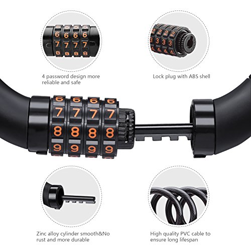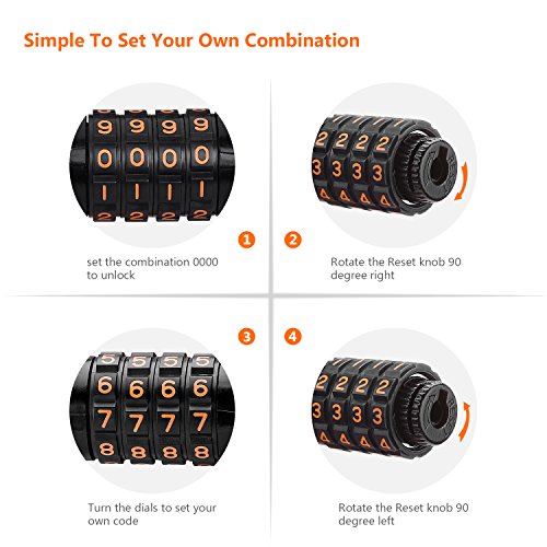 - ▲4-DIAL COMBINATION LOCKING DESIGN - 4 character password for keyless convenience, which lasts the lock with about one hundred thousand password combination for higher security; Ideal for bicycle lock, combination lock, cable lock, skateboards, sports Equipment, gates & fences, grills & lawnmowers, tools, tool boxes & ladders