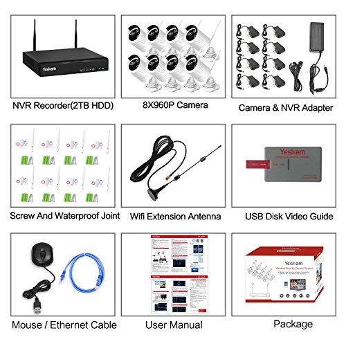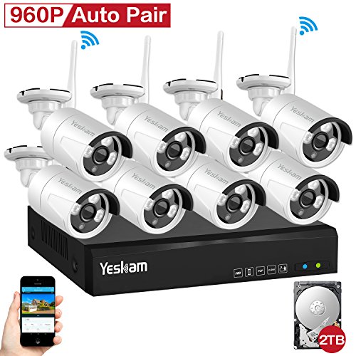 YESKAM Security Camera System Wireless 8 Channel 1.3MP WiFi CCTV Cameras Set Pre-installed 2TB HDD for Home Surveillance Built in Router Support Motion Detection Night Vision