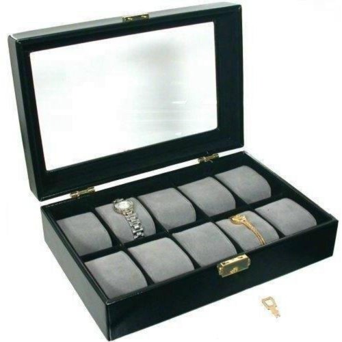 -. Feature : This is a new black faux leather watch case with glass top / This beautifully crafted box holds 10 watches / The interior is black faux leather and gray suede with a glass top / The box has a lock with a key to keep your watches safe at all times / Each slot measures approximately 2" wide