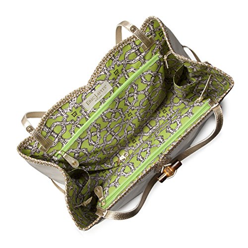 Jumbo size shopper comes in either white water repellent coated canvas or gold metallic linen which is not coated (for water repellence) but has been scotch guarded. Signature scallop edge is detailed with Squishee® braid.