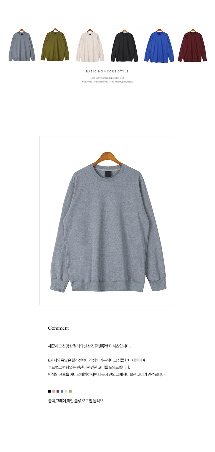 ▣상품설명 : 깨끗하고 선명한 컬러의 신상 긴팔 맨투맨 티셔츠입니다.6가지의 폭넓은 컬러선택이 장점인 기본적이고 심플한 디자인이며 부드럽고 변형없는 원단이 편안한 코디를 도와드립니다.단색의 셔츠를 이너로 매치하시면 더욱 세련되고 패셔너블한 코디가 완성됩니다.