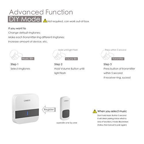 - It include 1 Receiver and 2 Transmitters, it working out of the box, and bears independent communication sign and enjoys with strong anti-interference ability and the function of false alarm prevention. By the way, the number of receiver and transmitter can be DIY, but must be various models that produced by CINBOS.