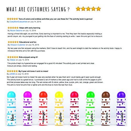 Learn, grow and play each set of dot markers comes with an activities book with 30 pages of fun for parents and toddlers to experience together. Promote positive early learning by teaching the alphabet, numbers and coloring! Highly recommended for preschools, kindergartens and homeschools.