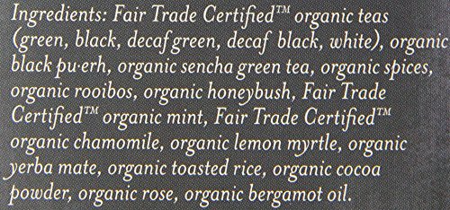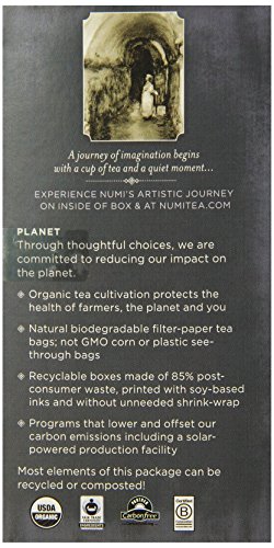 -. Feature : Eighteen of Numi's flavors in our signature mélange box / Tea Type: White Tea. Low Caffeine. Flavor Notes: Balance of complex citrus notes and luxurious spice. Available in 100 count bulk case of biodegradable, non-GMO Verified tea bags. A great value and less packaging. Stock up & save! / Numi offers premium loose leaf quality teas & herbs blended w/ only real fruits, flowers, & spices. All Numi Teas are organic, sugar free, fragrance free; & provide a delicious, healthy, & hydrating experience. / From farm to cup, Numi ethically sources directly from Fair Trade Certified & Fair Labor Verified tea gardens because we believe all people should be paid an equitable wage that allows their families & communities to thrive. / Numi is a social enterP.R.Ise, B Corporation. USDA Certified Organic, Non-GMO Project Verified, Carbon Free, Vegan, Gluten-free, Halal, Kosher, & uses post-consumer, recyclable, & biodegradable sustainable packaging.