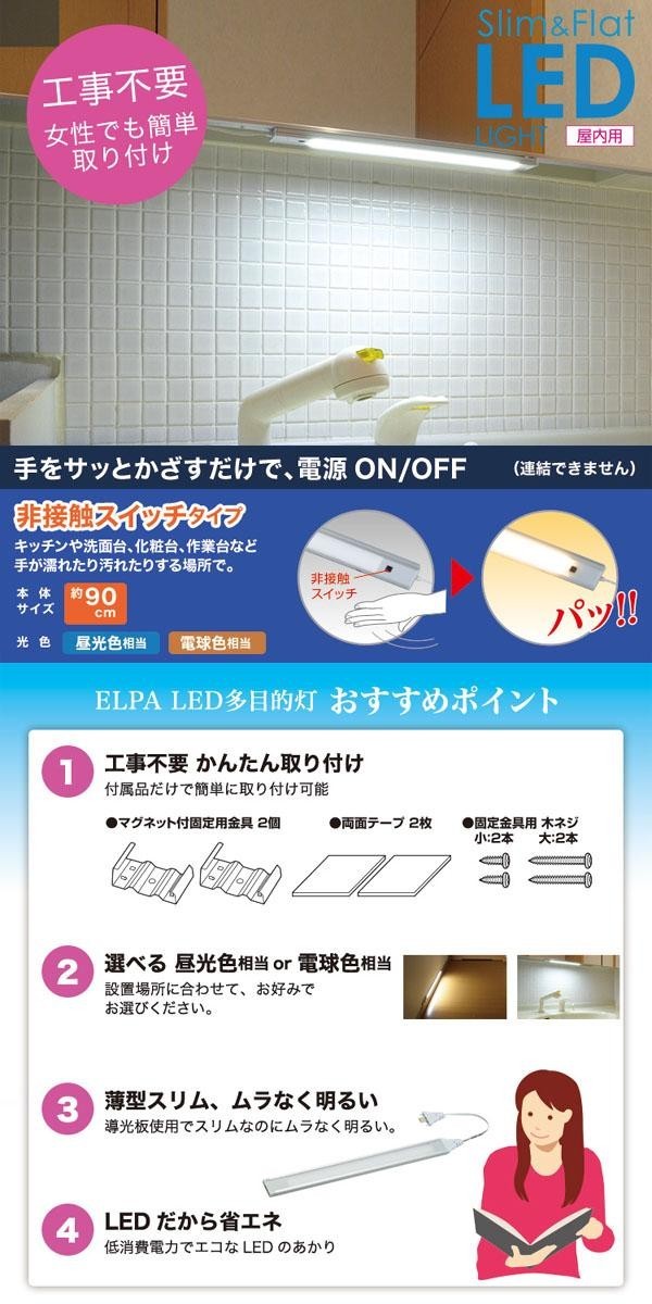 キッチン、物置の照明に。店舗のディスプレイ照明としても◎非接触スイッチに手をサッとかさずだけで、電源をON/OFFできます。導光板使用で、スリムなのにムラなくしっかり明るい!マグネット付アタッチメント、両面テープ、木ねじ(アタッチメント使用)で簡単取付♪低消費電力で長寿命なところもポイント。 |