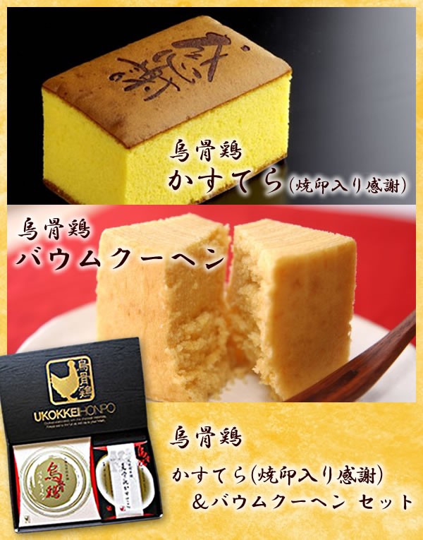 | 原材料 | 烏骨鶏かすてら:卵(烏骨鶏卵)、砂糖、小麦粉、加糖卵黄、はちみつ、水飴 烏骨鶏バウムクーヘン:卵(烏骨鶏卵)、砂糖、小麦粉、植物油脂、マーガリン、米粉、コーンスターチ、生クリーム、アーモンド、洋酒、膨張剤、乳化剤、香料(原材料の一部に大豆・乳成分を含む) |