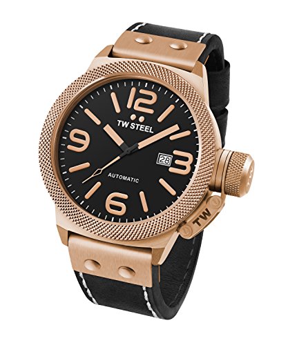 Automatic Movement 8215 from Miyota Made of high grade 316L steel PVD rose gold plated case Diameter of the case 50 mm Hammered bezel and steel pieces on leather strap Black dial Reinforced mineral crystal with sapphire layer Crown is covered by a crown cap which is attached to the case with a hook 10 ATM water resistant Black leather strap