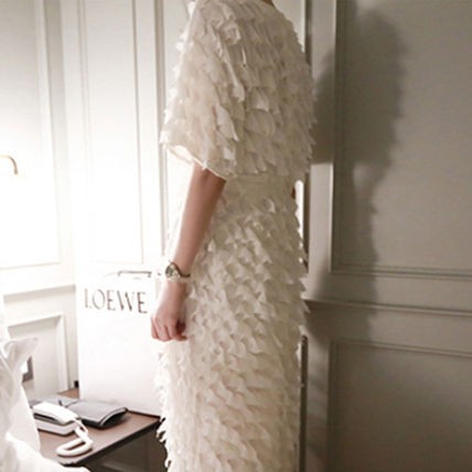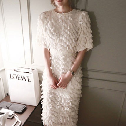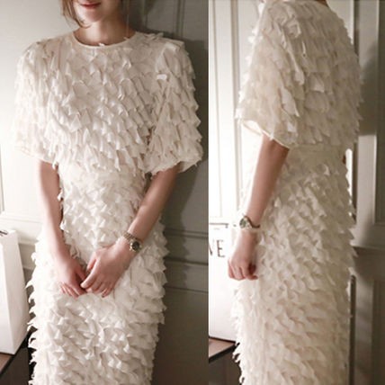 ワンピース全体のフリルが上品で清楚なミモレ丈ワンピース。