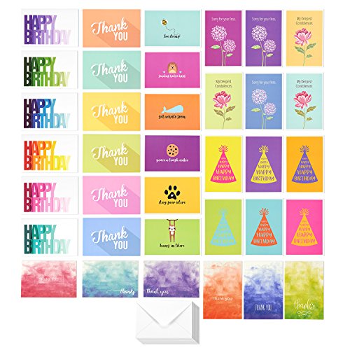-. Binding : Office Product -. Brand : Best Paper Greetings -. Color : Multicolored -. EAN : 0819132021513 -. Feature : All OCCASION CARD BOX SET: 36 pack of All Occasion greeting cards featuring 36 colorful and unique designs. / BLANK ON THE INSIDE: Contains 36 blank cards to include your custom messages for business and personal use. / SUPERIOR QUALITY: Each card is printed on high-quality 250 gsm paper card stock that is both elegant and extra durable. / BULK SUPPLY: Ensure you always have greeting cards on hand when occasions arise throughout the year. / DIMENSIONS: Each card measures 4 x 6 inches. Includes 36 corresponding V-flap, white envelopes. -. Label : Juvale -. Manufacturer : Juvale -. MPN : 051817-03-V1 -. PartNumber : 051817-03-V1 -. ProductGroup : Office Product -. ProductTypeName : PAPER_PRODUCT -. Publisher : Juvale -. Studio : Juvale -. Title : 36 Pack Assorted All Occasion Greeting Cards - Includes Assorted Happy Birthday, Sympathy, Thank You Cards - Bulk Box Set Variety Pack with Envelopes Included - 4 x 6 Inches -. UPC : 819132021513