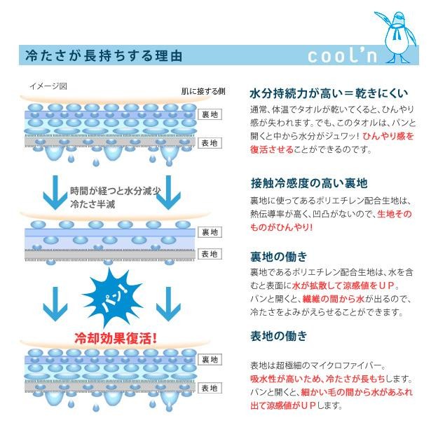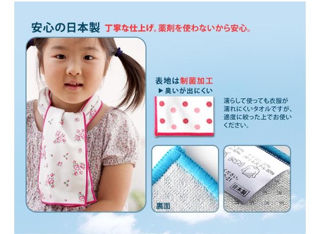 商品について:水に濡らすだけですぐに冷 える超冷感タオルです。化学物質を一切使わず乾いてもふんわりサラサラ。丁寧な縫製の日本製。