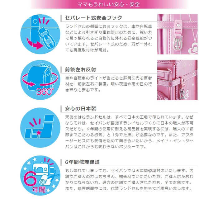 상품명 세이반 천사의 날개(새털,깃) 소녀 란도세루(초등학생이 어깨에 매는 가방) 러브《피》 갈리 사이즈(약cm) 외치수:높이 약33.5×폭약26.5×마치(깊이,폭)폭 약20cm,내치수:높이 약31×폭약23.5×마치(깊이,폭)폭 약11.5cm 소재 주요하 소재:펄 핑크펄 퍼플/클라리노® 《레미니카》® 펄,vivid 핑크밀키 브라운/클라리노® EFF 「레인 가이드® Fα」고, 등:breath 레더®(핑크)고, 어깨 벨트 뒤:breath 레더®(핑크) 중량 약1,175g 컬러 vivid 핑크,밀키 브라운,펄 핑크,펄 퍼플 기능#장 천사의 a군요 틸트 플레이트 좌우 연동배 캔 3D어깨 벨트 # 서게 되 비틀어《피타》 매미군요 등 환기 구조 락 패드 breath 레더 등W쿠션 락 패드 플렉스 321구조 스타일 키퍼 2 중감음 보강총 내켕김(팽팽하게 땅김/의욕)PET 손잡이《하》《메》《도루》 원터치 오토 록 방범 buzzer용 훅 열쇠 인#려고 해 훅 A4플랫 파일 사이즈 대응 세퍼레이트식 안전 훅 전후좌우 반사 안심 일본제 6년간 수리 보증 천사의 날개(새털,깃) 시리즈[모델 로얄 전통]