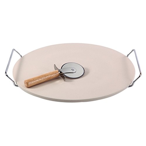 - 3-pc Set includes one each: 13" Ceramic Pizza Stone, Chrome Rack and Stainless Steel Pizza Cutter with Wood Handle