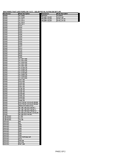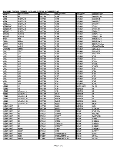 Studio : Identity Group Holdings, LLC Publisher : Identity Group Holdings, LLC Binding : Office Product Product Description The Porelon Adler Royal Alpha 600 Compatible Correctable Mylar Typewriter Ribbon replaces manufactures part #'s XC001, 013045, 250, 901250, 911250, and HYC01. This ribbon provides vivid and consistent black color in addition to exceptional light fastness and durable impressions. This product has been designed and manufactured to operate the original equipment identified, and will not void your equipment warranty. 2 pack. Porelon specializes in creating inking products and elastomers for a wide variety of industries. They focus their scientific, engineering and customer service efforts on delivering solutions that perform to your exact specifications. 0