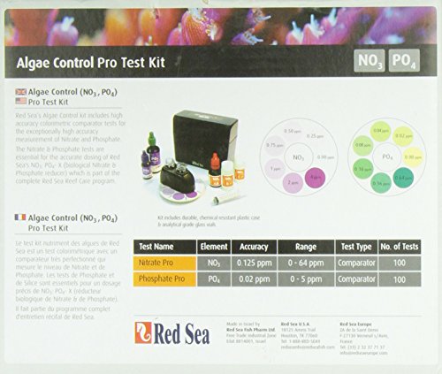 Red Sea algae control test kit includes high accuracy colorimetric comparator tests for the exceptionally high accuracy measurement of nitrate and phosphate. The nitrate and phosphate tests are essential for the accurate dosing of Red Sea's NO3: PO4- X (biological nitrate and phosphate reducer) which is part of the complete Red Sea Reef Care Program. The kit also includes a durable, chemical resistant plastic case and analytical grade glass vials. Multi test kit employs a comparator that eliminates fumbling or awkward handling of test vials as well as difficult to match color charts or color chips. Ease-of-use rewards new and experienced reef hobbyists with fast and accurate results. 100 Nitrate Pro tests with accuracy of 0.125 ppm and 100 Phosphate Pro tests with accuracy of 0.02 ppm.Feature