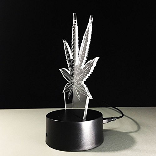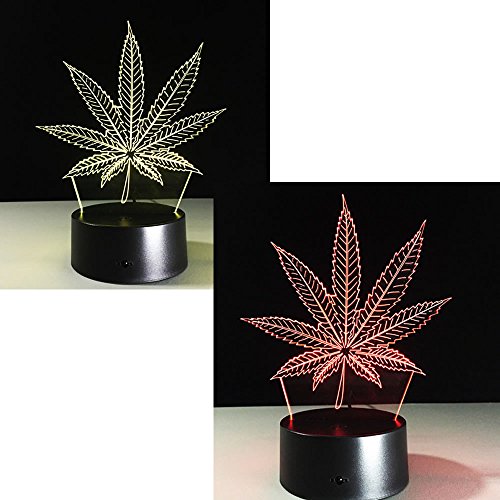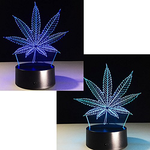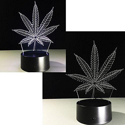 Features: 1.3D illusion lamp with optical effect for a marijuana leaf. 2.7 color changing desk night light: red, blue, green, yellow, cyan, white, purple. 3.Easy touch sensor control, simple touch to change the color and turn on/ off the light. 4.USB powered desk lamp light (needs an extra adapter), also provided with battery container to run with batteries ( The package does not include any batteres or adapters) 5.Crazy Lighting decorations for Marijuana / Cannabis / weed parties at night.