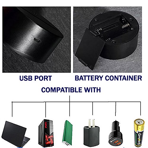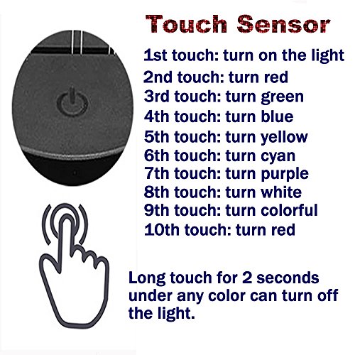 Specification: Material: Acrylic flat plus ABS light base Light Source:9 Leds Input voltage: 5V Power:3W Light base: 88 x 88 x 42mm Color:7 colors:red, blue, green, yellow, cyan, white, purple. Control: Touch control Drived by: USB cable powered (need an extra adapter) or 3x1.5V AAA batteries(not provided)