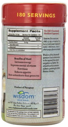 -. Binding : Grocery -. Brand : Wisdom Of The Ancients -. Department : Health and Beauty>Health and Wellness -. EAN : 5052958523761 -. Feature : Yerba mate is a naturally energizing tea with a smooth, slightly sweet taste / Blended with stevia leaves, which add their own 100 natural nutrients and create a delightfully pleasant flavor / Contains 350 natural vitamins, minerals, flavonoids, antioxidants and all of the other wonderful compounds our bodies require on a daily basis / All natural / Non GMO, product of Paraguay / All-Natural Energy Booster / More antioxidants than green tea with less caffeine / Rich in vitamins and minerals with 196 active compounds / Convenient Instant Powder / Great for Iced Tea / Contains stevia -. IsAdultProduct : 0 -. IsAutographed : 0 -. IsMemorabilia : 0 -. Label : Wisdom of the Ancients -. LegalDisclaimer : Information about this product is provided for informational purposes and is not meant to substitute for the advice provided by your own physician or other medical professional. You should not use the information contained herein for diagnosing or treating a health problem or disease, or prescribing any medication. You should read carefully all product packaging. If you have or suspect that you have a medical problem, promptly contact your health care provider. Information and statements regarding dietary supplements have not been evaluated by the Food and Drug Administration and are not intended to diagnose, treat, cure, or prevent any disease. All discounts are taken from sested retail prices. -. Manufacturer : Wisdom of the Ancients -. Model : YR-INS -. MPN : 403307 -. NumberOfItems : 1 -. PackageQuantity : 1 -. PartNumber : 403307 -. ProductGroup : Grocery -. ProductTypeName : GROCERY -. Publisher : Wisdom of the Ancients -. Size : 2.82 oz -. Studio : Wisdom of the Ancients -. Title : Wisdom of the Ancients Instant YerbaMate Royale, 2.82 Ounce (Packagging May Vary) -. UPC : 716123123563