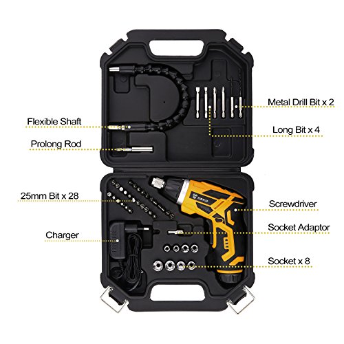 PACKAGE CONTENTS:with 34 different driver bits and 8 sockets,ect.,you can choose any one of them depend on your various operation.Also includes a charger,a Li-ion battery.Quickly and easily recharged ready for the next job