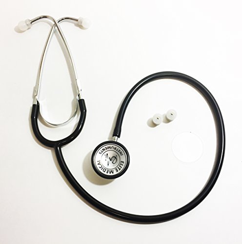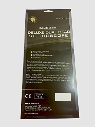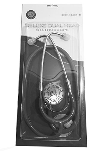 -. Binding : Health and Beauty -. Brand : Elite Medical Instruments -. Color : Black -. Feature : Includes a spare diaphragm and pair of soft ear tips / Dual-head chest piece with the bell on one side and the diaphragm on the other / Light weight aluminum chest piece / Tubing is 22" long, single-channel, and latex free / Brand: Elite Medical Insturments -. IsAdultProduct : 0 -. Label : Elite Medical Instruments -. Manufacturer : Elite Medical Instruments -. MPN : ECB-501 -. PartNumber : ECB-501 -. ProductGroup : Health and Beauty -. ProductTypeName : HEALTH_PERSONAL_CARE -. Publisher : Elite Medical Instruments -. Studio : Elite Medical Instruments -. Title : EMI Dual Head Stethoscope - BLACK ESD-122