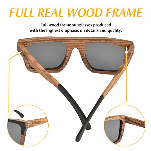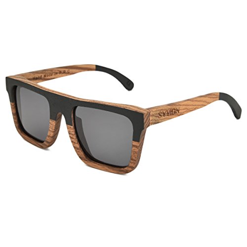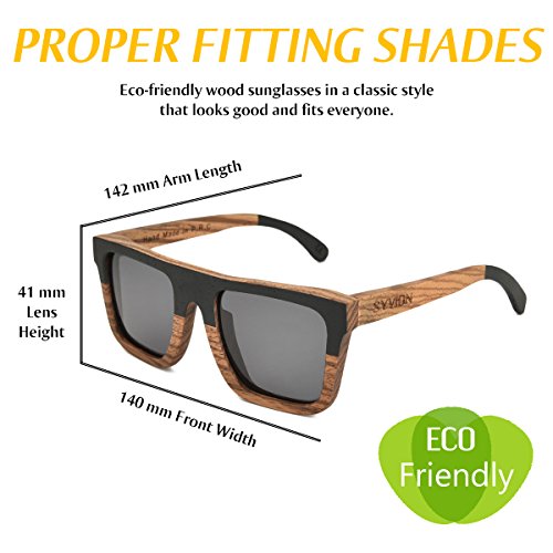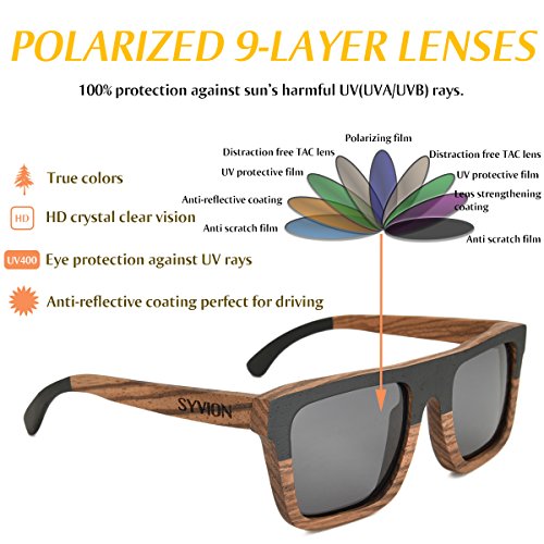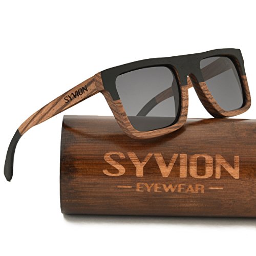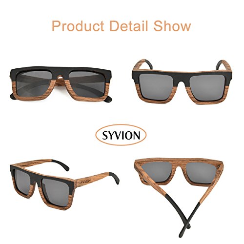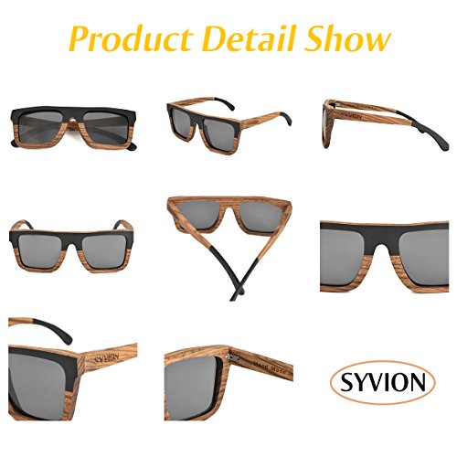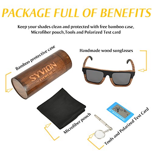 Product Description SYVION WOODEN SUNGLASSES Feature: -Our sunglasses are hand crafted with organic wood for a unique design that looks and feels great. -The lightweight Zebra Wood offers a comfortable fit that is durable and sturdy at the same time. -Our unique stainless-steel, double-spring hinges are sturdy and designed to keep their shape year after year. -30-Day Money back Guarantee. Package Content: -1 X Zebra Wood Polarized Sunglasses -1 X Microfiber Pouch -1 X Bamboo Case -1 X Polarized Test Card -1 X Mini Screwdriver Good wood gift Due to the type of the material used and the handmade production process, each pair of wooden sunglasses is unique. With bamboo case ,This makes the product a very good wood gift , PERFECT GIFT FOR YOURSELF OR THAT SPECIAL SOMEONE. 0