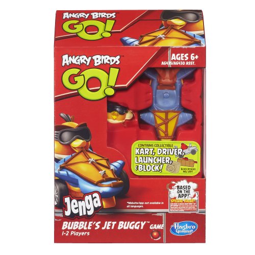 - Feature : Bubble's Jet Buggy Game challenges you to hit the block with your kart, driver and launcher / Take turns launching / The first player to take 2 of 3 rounds wins / Play solo and count the number of shots it takes you to hit the block and beat your own best (lowest) score to win / For more fun, collect all six Angry Birds Go! Jenga Kart & Racer Game sets (sold separately) to assemble the Pig Tower