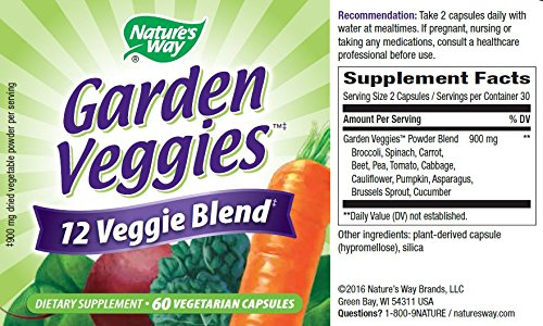 ReleaseDate : 2007-06-21 Studio : Nature's Way Publisher : Nature's Way Binding : Health and Beauty Product Description Life and energy. Super antioxidant activity. 12 veggies. No fillers. 100% dried whole veggie juice. Life and Energy: Each Garden Veggies capsule contains over 3,000 phytonutrients taken from 12 whole vegetables. This broad spectrum of nutrients are essential to health, vitality and energy. Garden Veggies helps provide some of the benefits of eating vegetables. 4X More Antioxidant Power: Tests show Garden Veggies delivers more antioxidant capacity (ORAC) than other brands. Unique Flash-Glancing: Made under low temperatures, Garden Veggies contains nutrients and enzymes not found in other products. Immediate Absorption: Because Garden Veggies contains no binders and no excipients, its nutrients are quickly absorbed into the bloodstream. 0