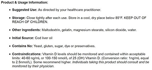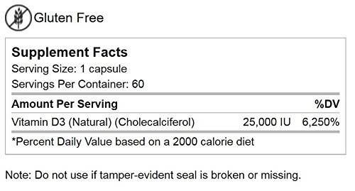 -. Feature : 25,000 IU Vitamin D3 (Natural) (Cholecalciferol) / 60 capsules / Gluten free. Yeast free. Sugar free. Dye free. Preservative free. / Initial Source: Cod liver oil. Other Ingredients: Maltodextrin, gelatin, magnesium stearate, silicon dioxide, water. / Sested Use: Take as directed by your healthcare practitioner. Not a daily use supplement.