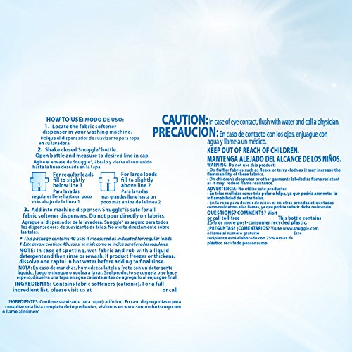 -. Binding : Health and Beauty -. Brand : Snle -. EAN : 0072613455140 -. Feature : 40 loads. / Gives your laundry a boost of freshness. -.It leaves clothes smelling clean and awakens your senses with bursts of freshness all day long. -.Safe for all HE washing machines. -.Leaves clothes and blankets feeling soft and comfy after each wash. -.Gives you up to 40 loads of softness. -. Label : AmazonUs/SV7HJ -. Manufacturer : AmazonUs/SV7HJ -. Model : 10072613455147 -. MPN : 10072613455147 -. NumberOfItems : 1 -. PackageQuantity : 1 -. PartNumber : 10072613455147 -. ProductGroup : Pantry -. ProductTypeName : HEALTH_PERSONAL_CARE -. Publisher : AmazonUs/SV7HJ -. Studio : AmazonUs/SV7HJ -. Title : Snle Liquid Fabric Softener with Fresh Release, Blue Sparkle, 32 Fluid Ounces -. UPC : 072613455140