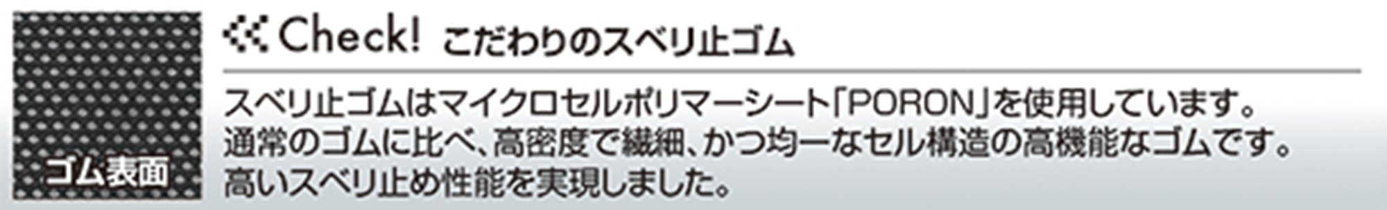 · Lubber stop rubber uses micropolymer sheet "PORON" realizes high sliding prevention performance with high performance, high-density rubber with a high density, delicate and uniform cell structure compared with ordinary rubber.