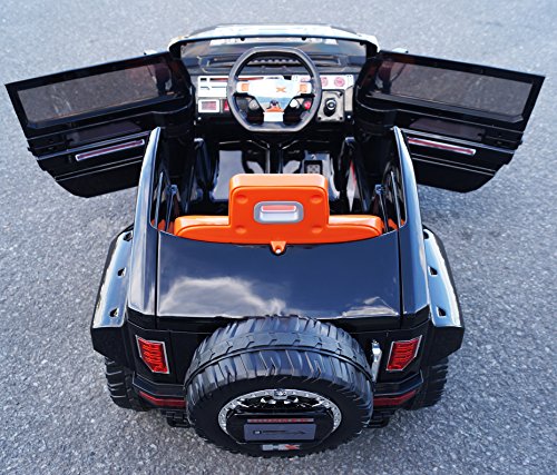 -. Feature : Real Black Paint, Parental Remote Control / Adjustable Seatbelt, Shock Absorbers , LED lights / 1 12V-7AH battery, 2 Motors , Opening Doors / Mp3 Connector, Music, Engine and Horn Sounds / Volume Control, Battery Indicator, Speed: 2-3 mph