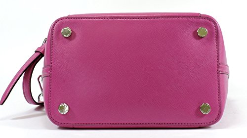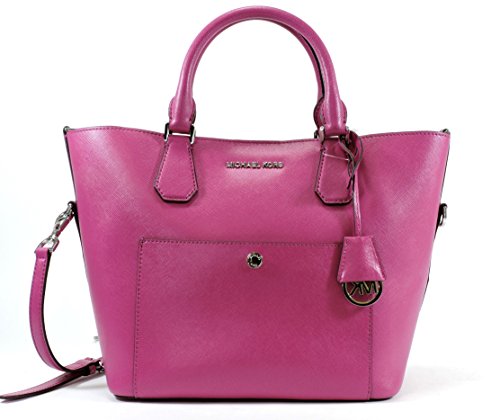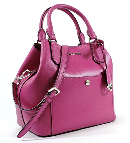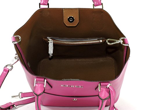 MICHAEL Michael Kors two-tone saffiano leather bucket bag. Tote handles with rings; removable, adjustable shoulder strap. Drawstring gathers top; snap closure. Exterior front slip pocket with logo snap. Unlined; one zip pocket. Approx. 10"H x 14"W x 6"D. Feet protect bottom of bag.Feature