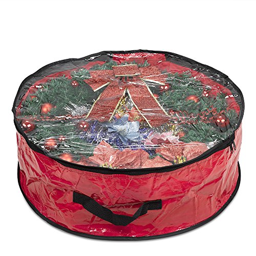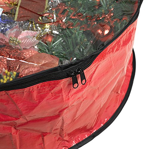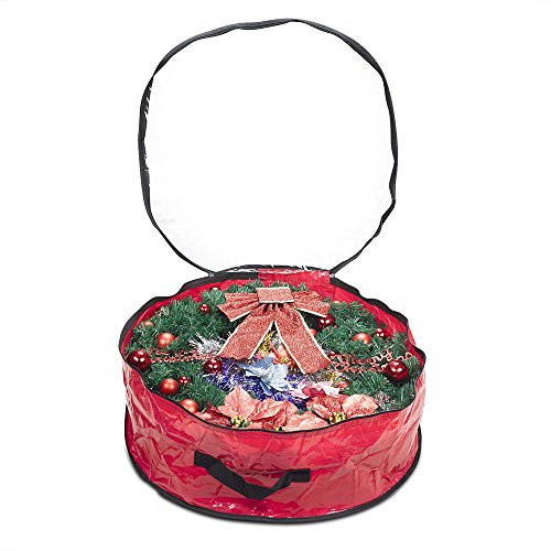 Wreath Storage Bag By Propik Polyester Tear Resistant Fabric For Holiday Easy Storage With Clear Window Featuring Heavy Handel’s And Transparent Card Slot 24” X 24” X 8” (Red)